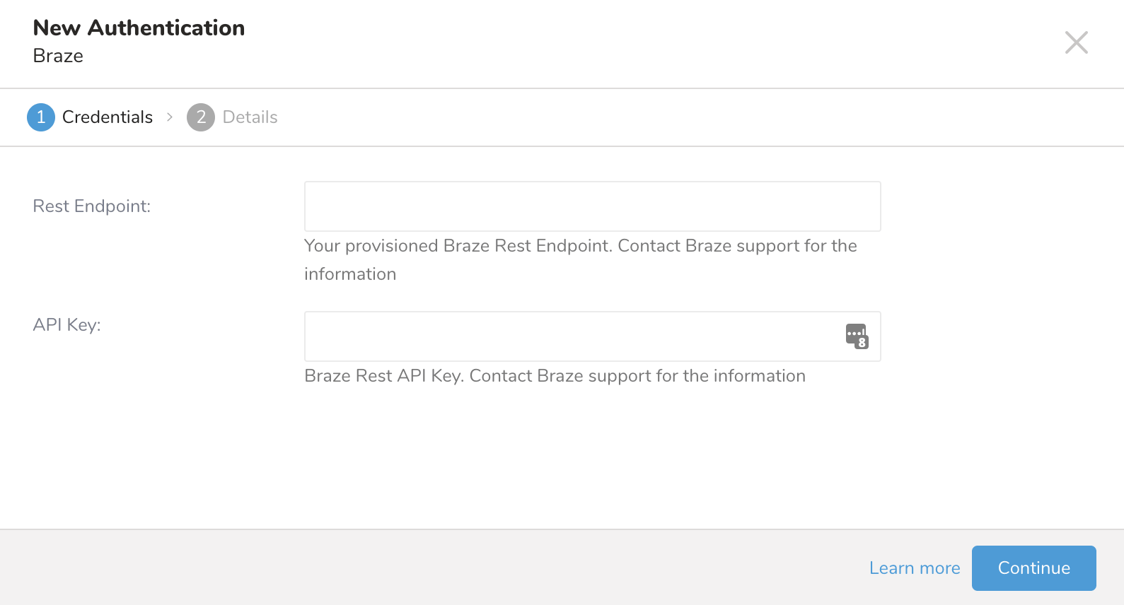 No prompt New Authentication (Nova autenticação) exibido, dê um nome à sua conexão e forneça a chave da API REST e o endpoint REST da Braze. Selecione Done (Concluído) quando terminar.