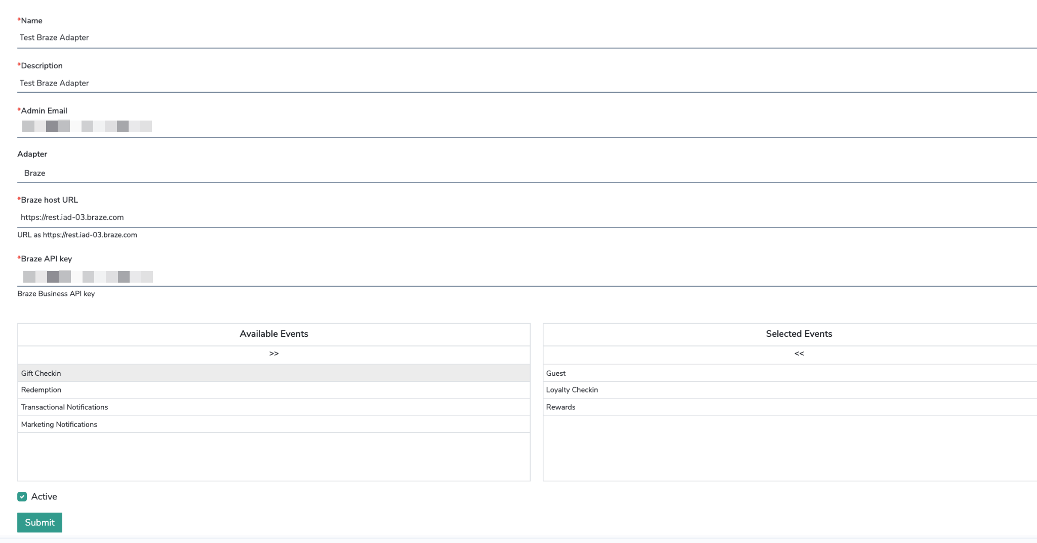 - Preencha o nome do adaptador, a descrição e o e-mail do administrador. Selecione Braze como seu adaptador e forneça seu ponto de extremidade da API REST do Braze e a chave de API do Braze.