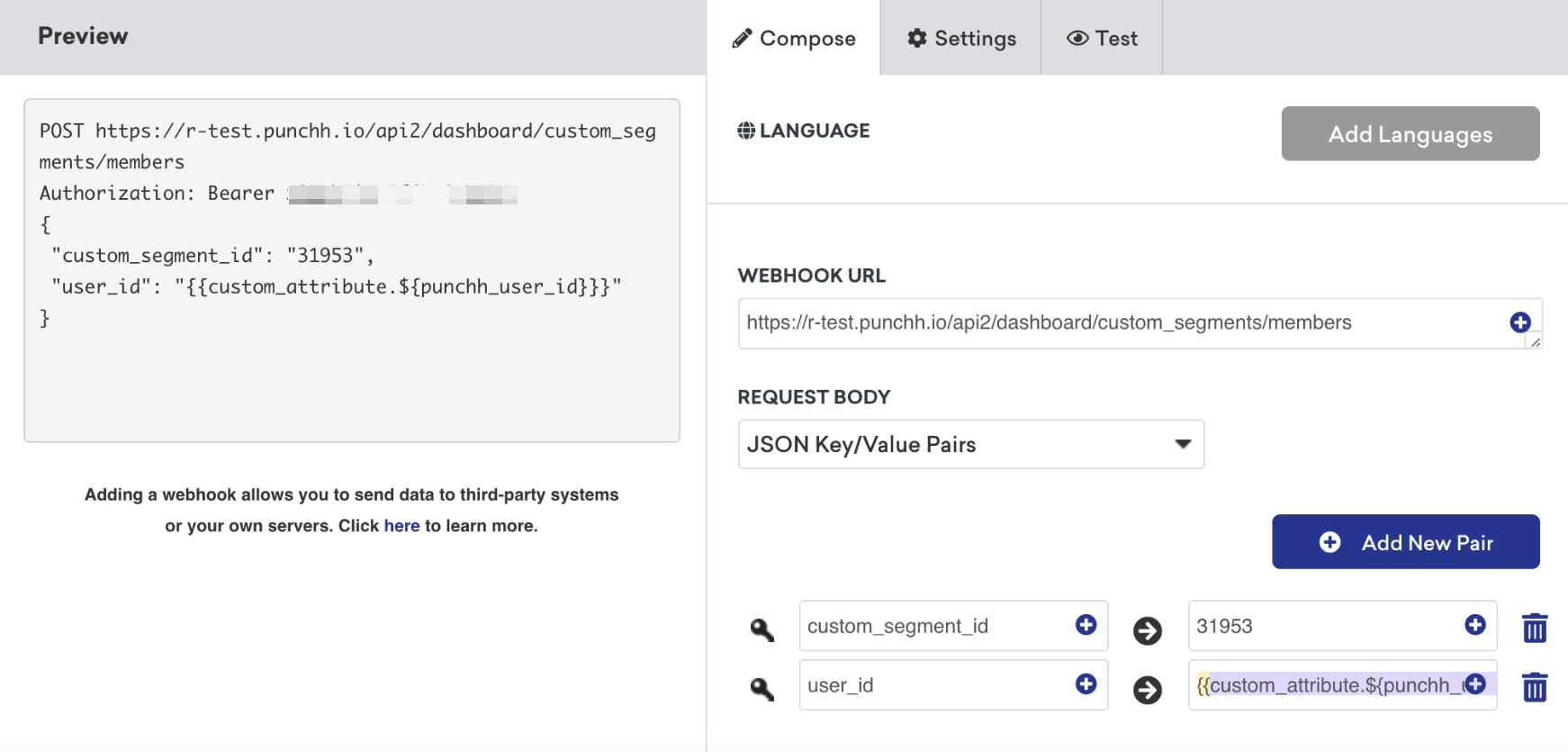 Crie uma campanha de webhook no Braze usando o endpoint Punchh para adicionar um usuário a um segmento personalizado como o URL do webhook. Aqui você pode fornecer o