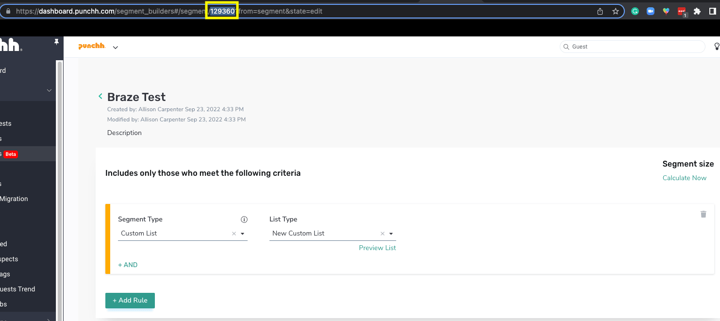 custom_segment_idpresente no URL do dashboard do segmento da Punchh, conforme mostrado abaixo. Podem ser usados os criadores de segmentos clássicos ou beta. No entanto, a versão beta é recomendada, pois a versão clássica acabará sendo descontinuada.