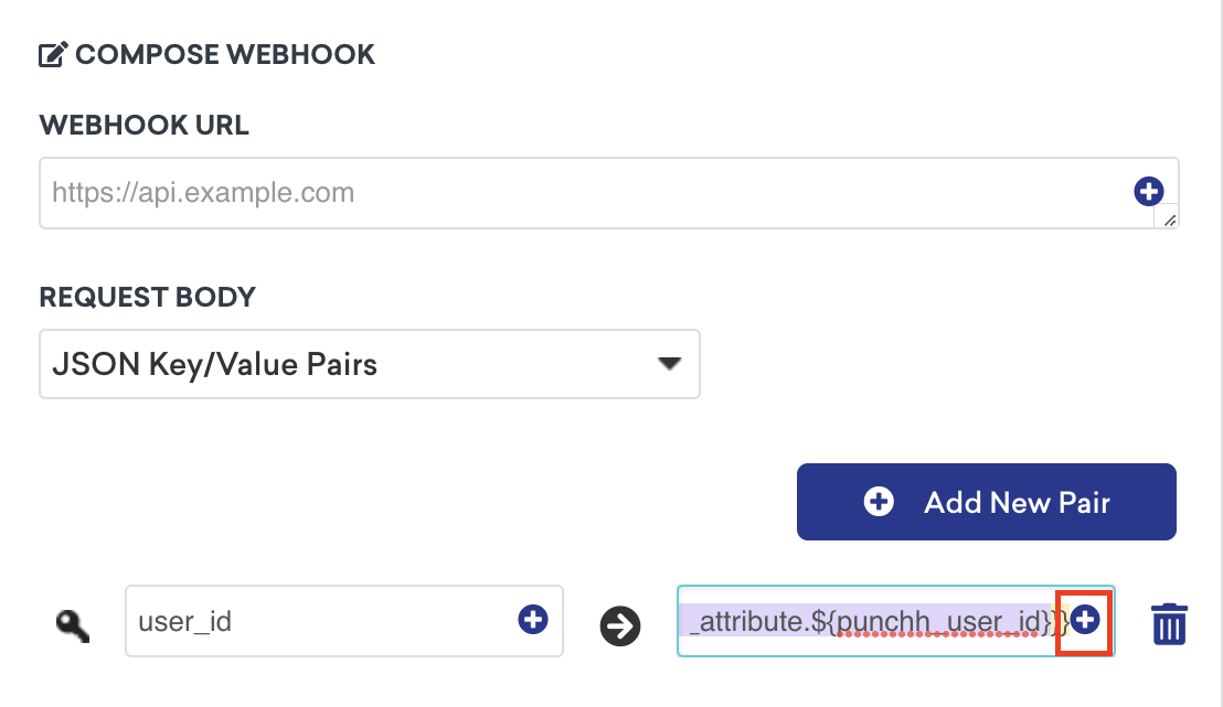 A chaveuser_idno webhook mapeia o ID de usuário da Punchh. Esse identificador precisará ser adicionado a todos os webhooks criados no Braze para adicionar usuários a um segmento personalizado da Punchh. O atributo personalizadopunch_user_idpode ser preenchido dinamicamente como o valor da chaveuser_idusando o Liquid. Você pode inserir a variável de atributo personalizadopunchh_user_idusando o ícone azul de “mais”, localizado no canto superior direito de qualquer campo de texto de modelo.