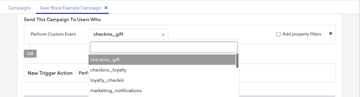 A adição de um gatilho abre a lista de eventos criados no Braze. Escolha o evento que deve disparar a campanha ou o Canva a ser enviado ao usuário que registrou o evento.