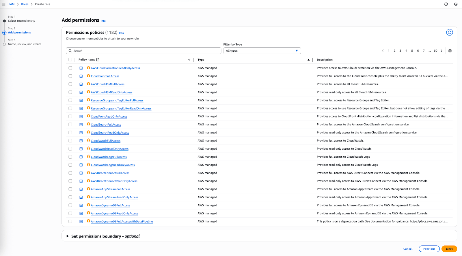 - Na guia Permissões, selecione Adicionar permissões, anexe diretamente a política e, em seguida, selecione essa política.