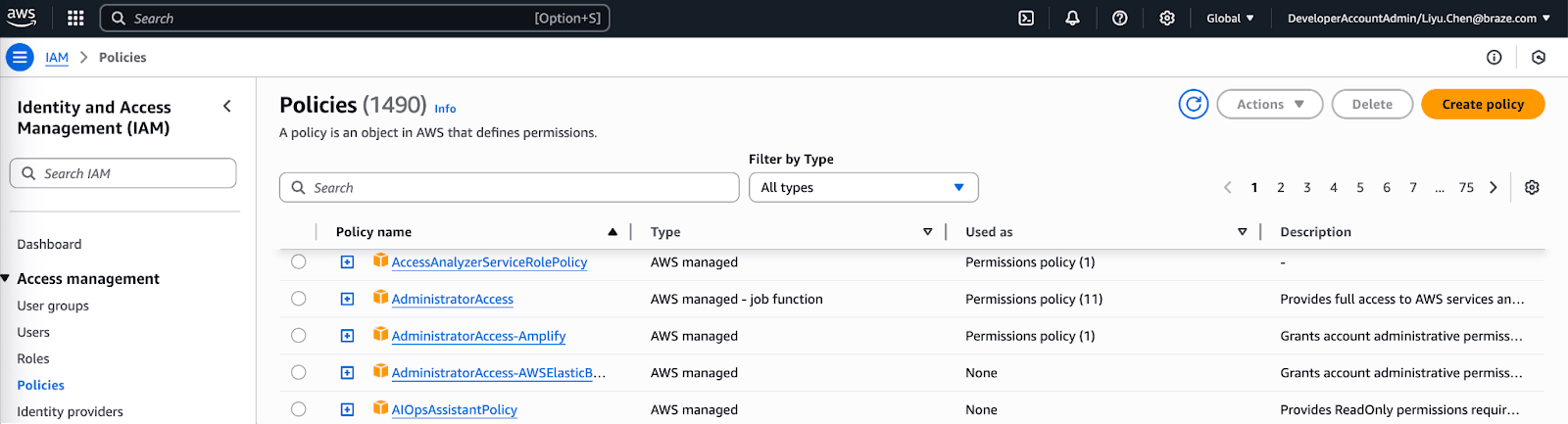 - No console da AWS, vá para a seção IAM > Políticas e selecione Criar política.