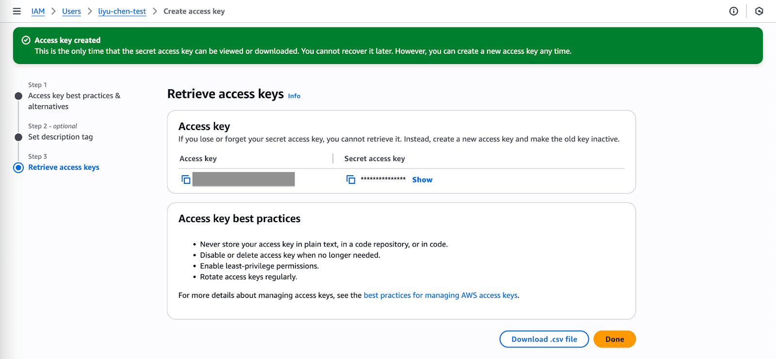 - Depois de criar um novo usuário, gere a chave de acesso e faça o download do ID da chave de acesso e da chave de acesso secreta.
