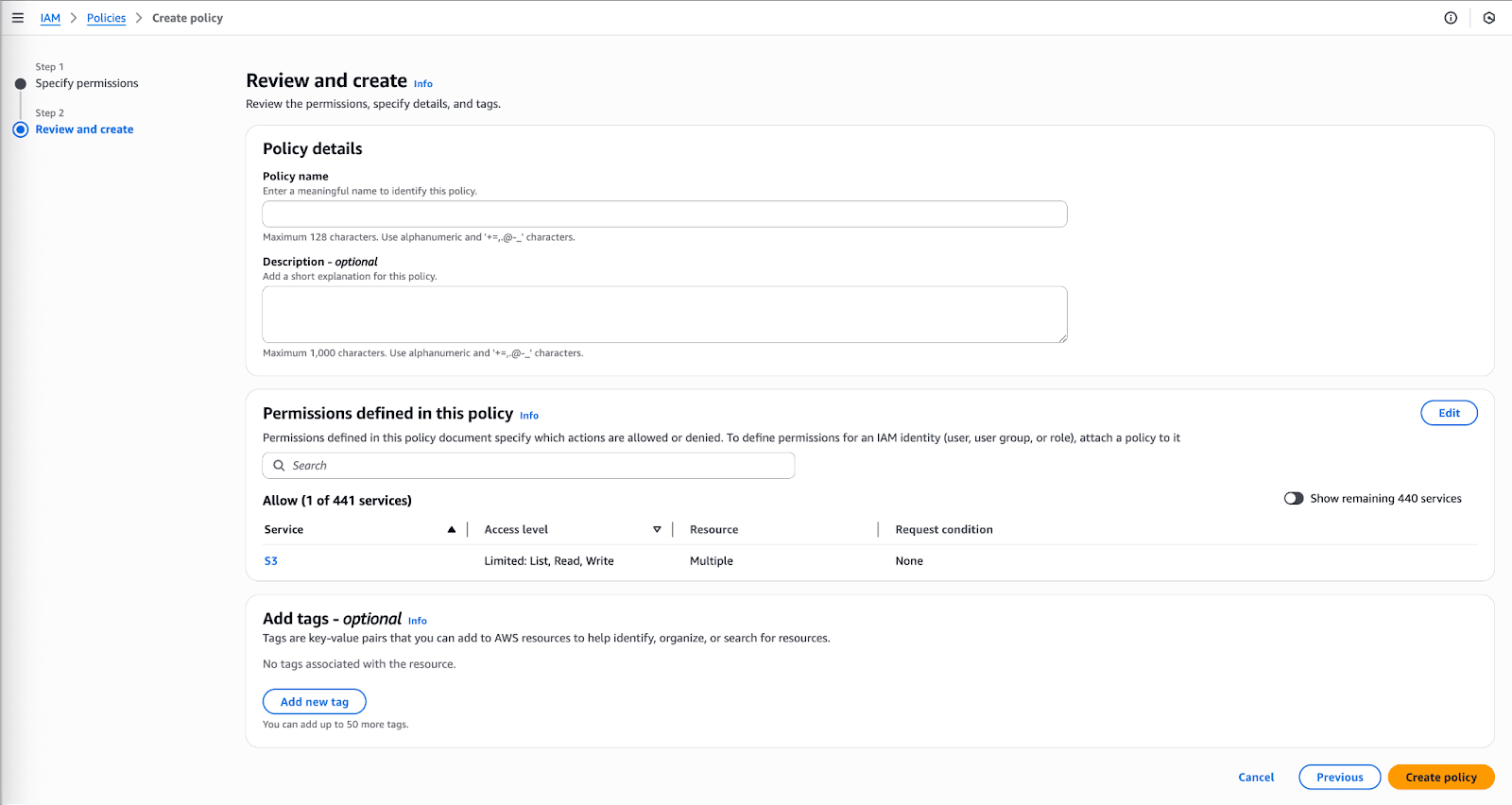 !Uma página que permite que você revise sua política e, opcionalmente, adicione permissões.
