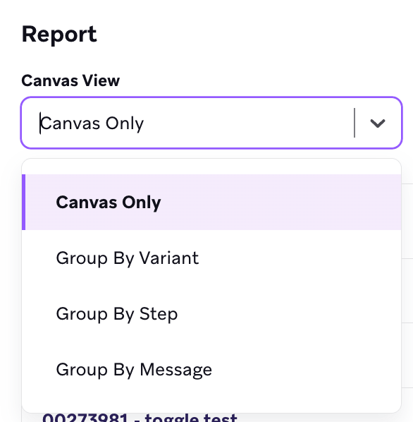 Se você quiser fazer um relatório sobre as variantes ou etapas do Canvas, selecione Canvases for rows (telas para linhas) e deixe o campo em branco ou selecione Date (data ) como a pesquisa. Isso cria um menu suspenso de visualização do Canvas para exibir métricas somente para o Canvas ou agrupar métricas por variante, etapa ou mensagem.
