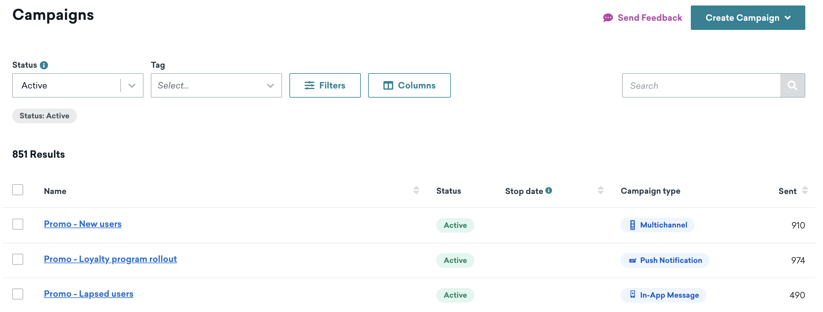 À medida que você cria mais campanhas em seu espaço de trabalho, é possível ajustar os filtros e as colunas na lista de campanhas para classificar e organizar essas campanhas. O uso de uma combinação desses métodos de pesquisa pode ajudar a restringir seus resultados, especialmente à medida que sua lista de campanhas aumenta.