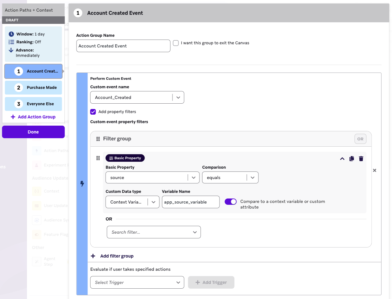 O Action Path a seguir é configurado para classificar os usuários que realizaram o evento personalizado Account_Created com a propriedade básica source para a variável de contexto app_source_variable.