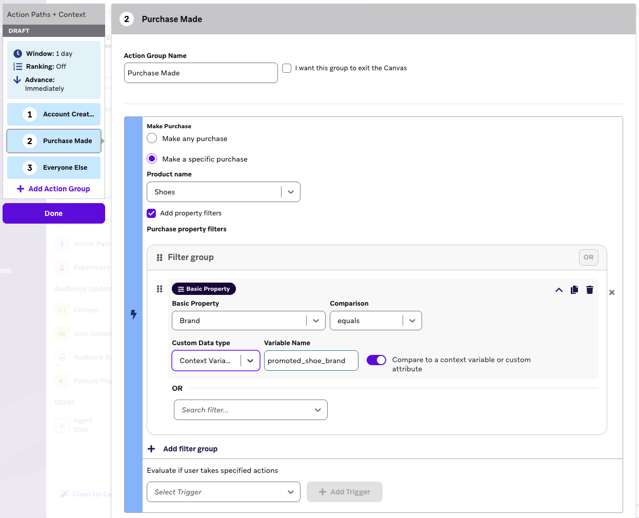 Você pode aproveitar a comparação de filtros de propriedade com variáveis de contexto ou atributos personalizados nessas ações de acionamento: Realizar evento personalizado e fazer a compra. Esses acionadores de ação também suportam filtros de propriedade para propriedades básicas e aninhadas.