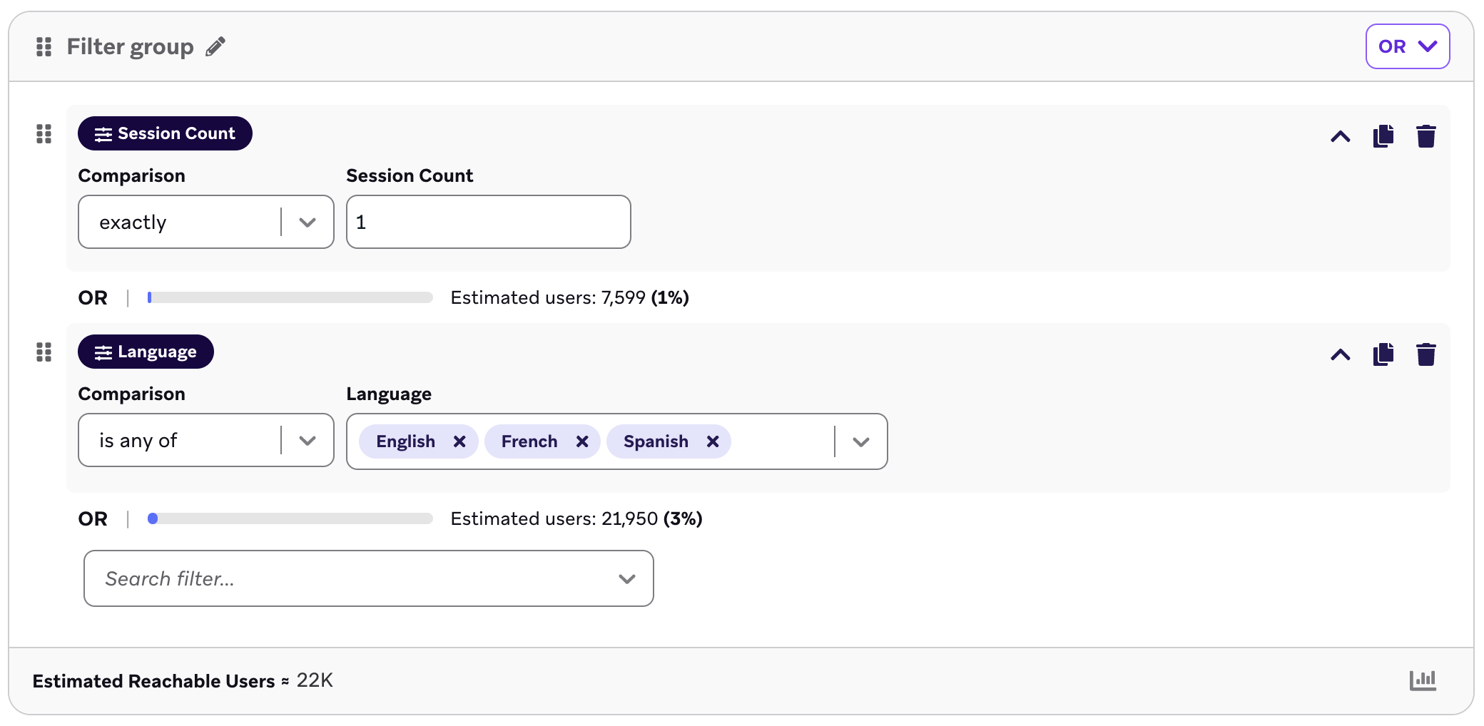 Selecionar “OR” para seus filtros significa que seu segmento conterá usuários que satisfaçam qualquer combinação de um, alguns ou todos esses filtros. Selecionar “AND” significa que os usuários que não passarem nesse filtro não serão incluídos no seu segmento.