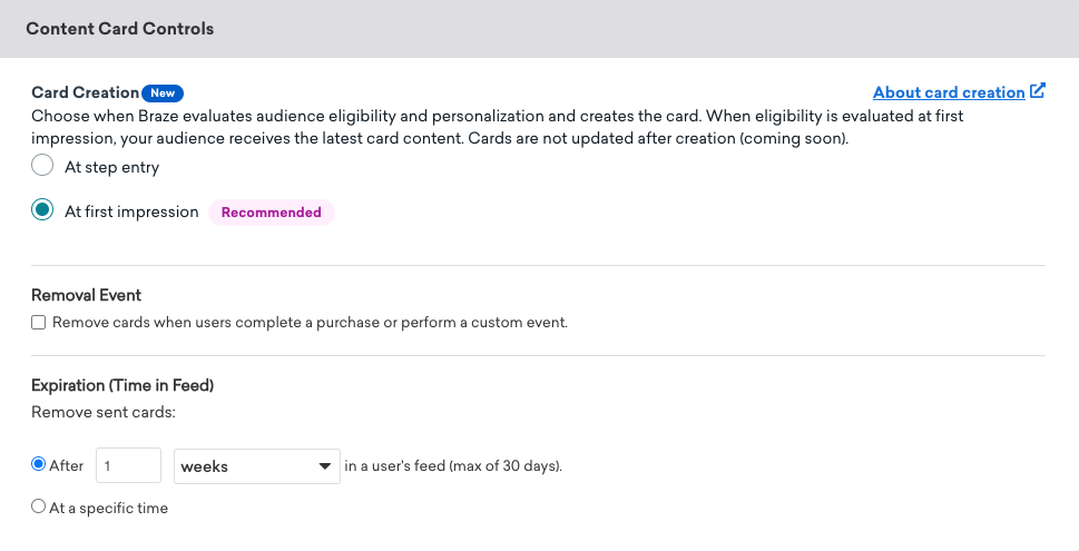 Você pode escolher quando o Braze avalia a elegibilidade e a personalização do público para novas campanhas de cartão de conteúdo e etapas do canva, especificando quando o cartão é criado.