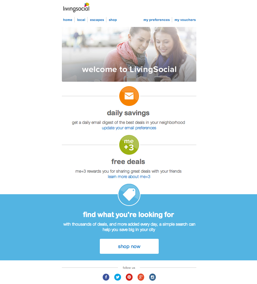 Quando seus usuários são integrados, forneça dicas úteis para começar e mostre apenas os recursos mais essenciais. Tente sempre enviar um email de boas-vindas após um usuário se inscrever. O seguinte é um exemplo do LivingSocial que contém chamadas simples para ação e informa os usuários sobre uma oferta:
