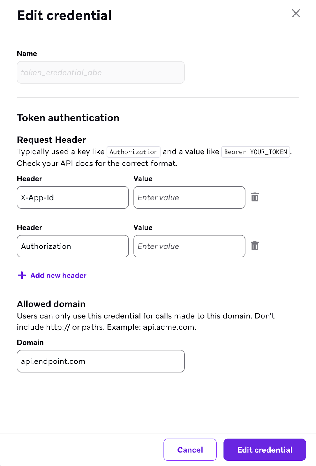 Para adicionar uma credencial que contém valores de token, selecione Adicionar credencial > Autenticação por token. Em seguida, adicione os pares chave-valor para os cabeçalhos de chamada da sua API e o domínio permitido.