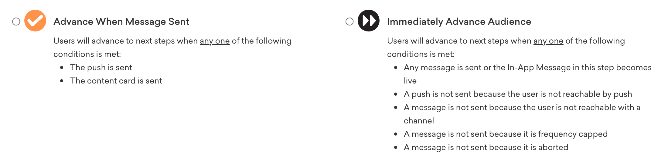 As with other Canvas messaging channels, Content Cards will be sent to a user’s device when they meet the audience and targeting criteria specified for its step. After the Content Card is sent, it will be available in each eligible user’s feed the next time their cards feed is refreshed.