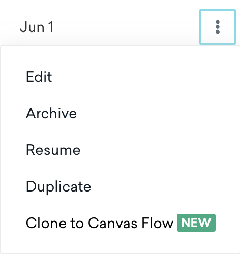 - Identify the Canvas you want to create a copy of in the Canvas Flow workflow. You can clone Canvases with a Draft, Active, or Stopped status.