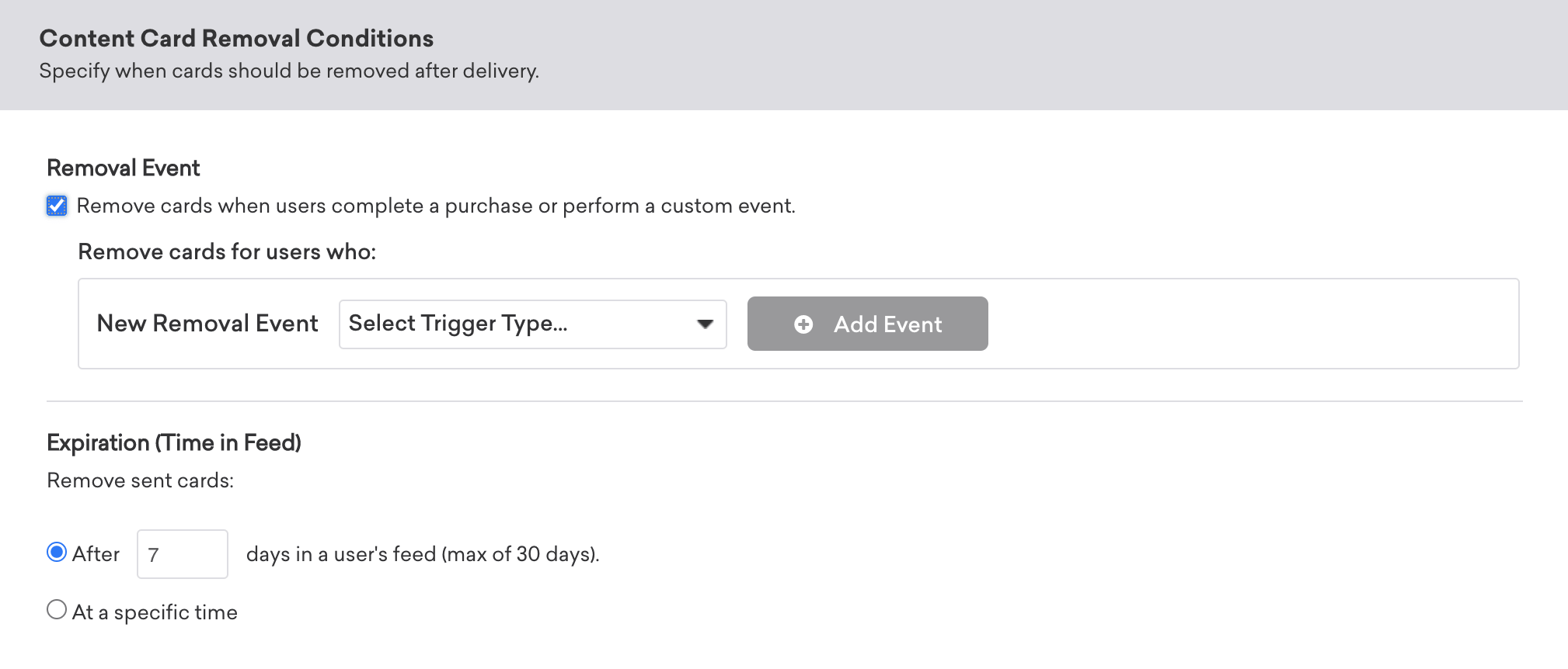 - Choose whether to remove Content Cards when users complete a purchase or perform a custom event.