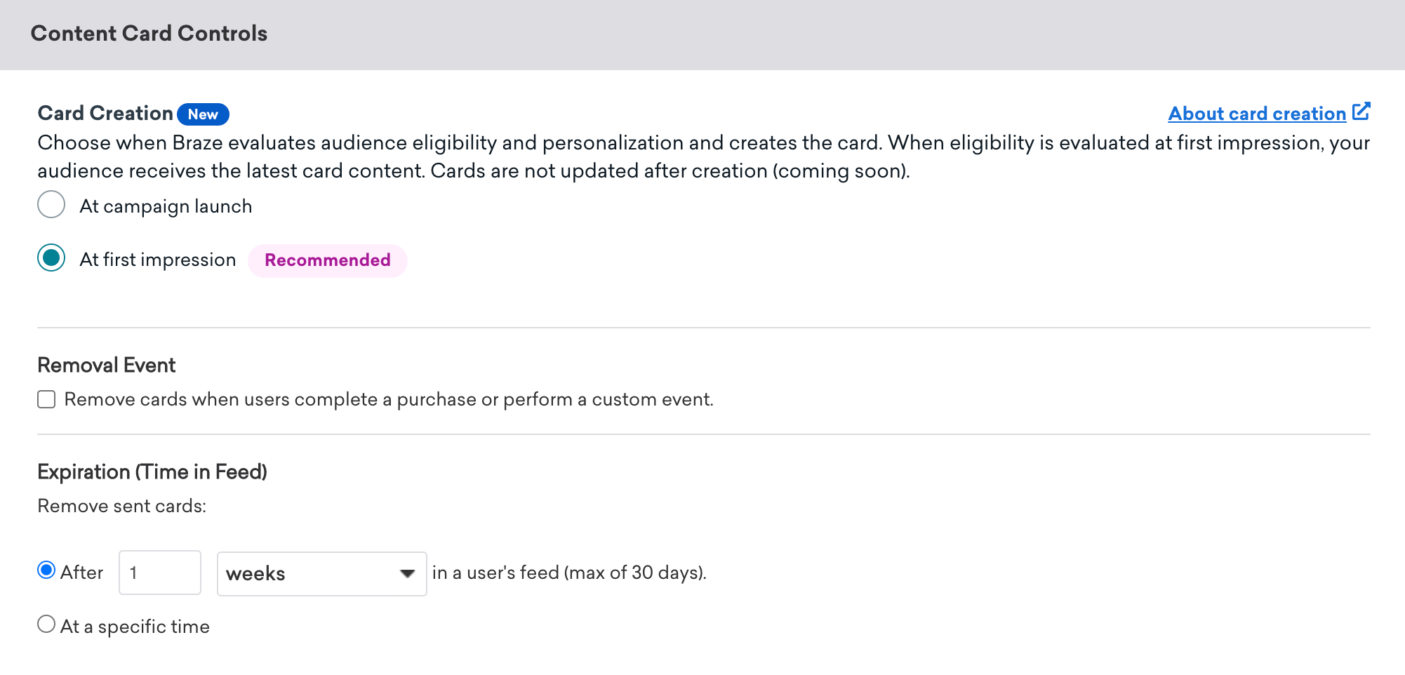 You can choose when Braze evaluates audience eligibility and personalization for new Content Card campaigns and Canvas steps by specifying when the card is created.