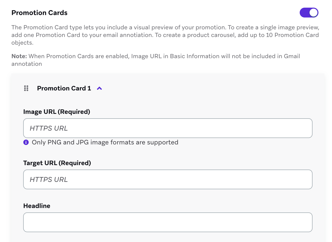 Choose whether to include a discount offer, deal card, promotion card, or all options for your Gmail Promotion card.
